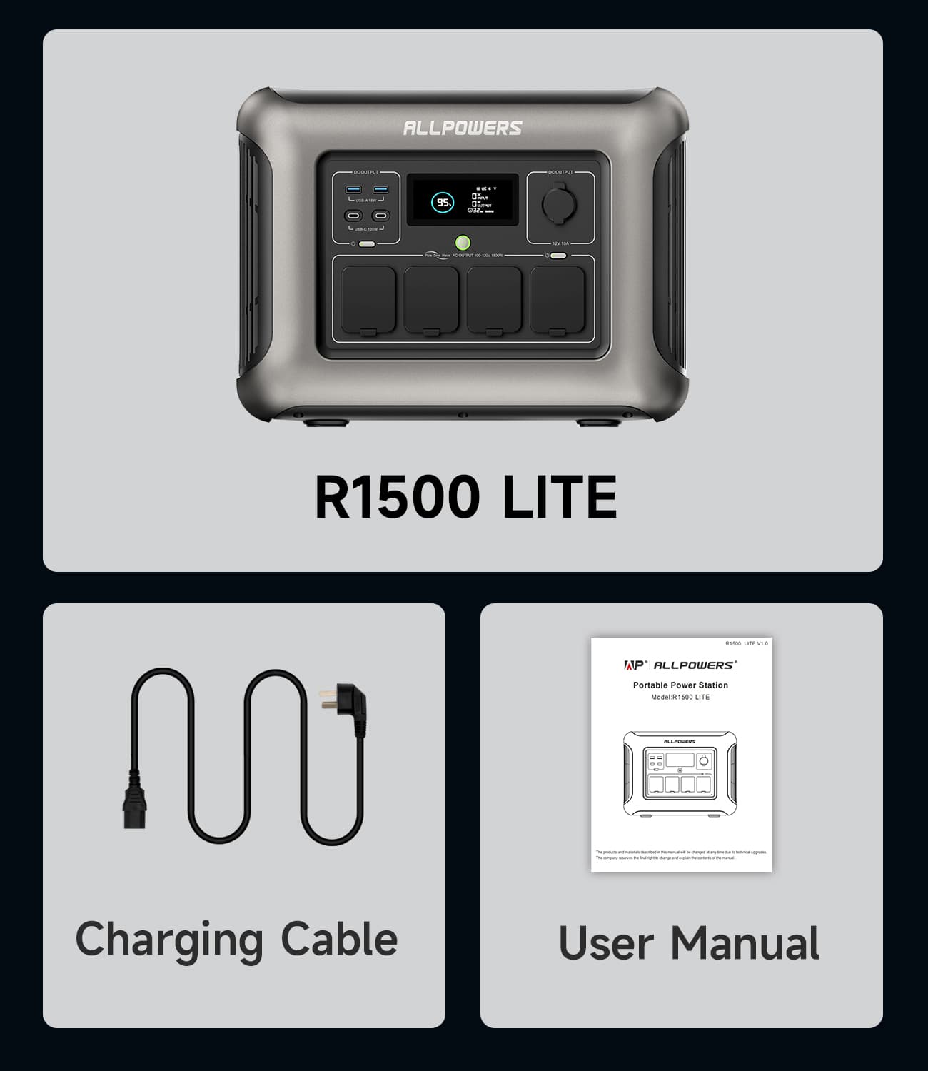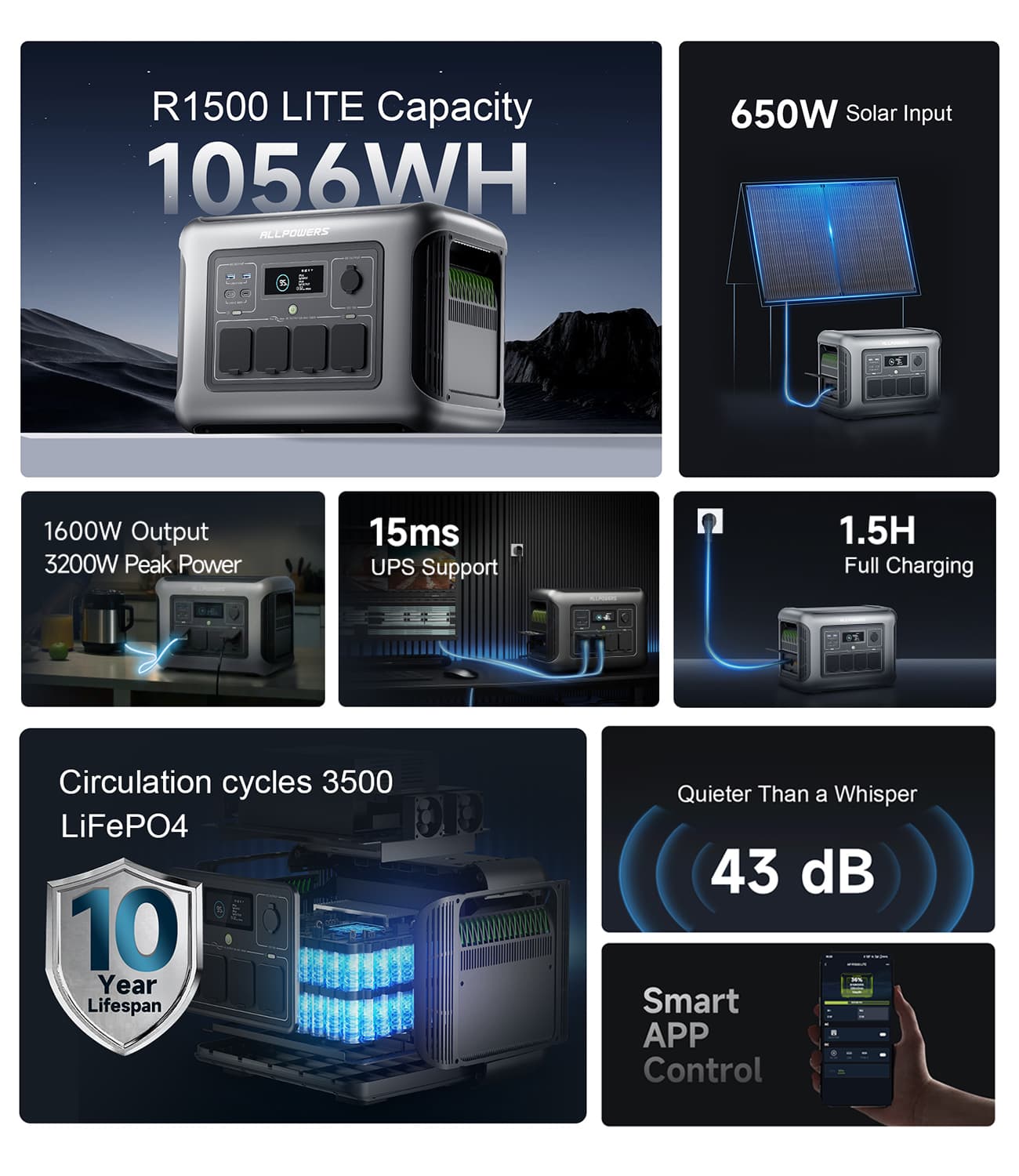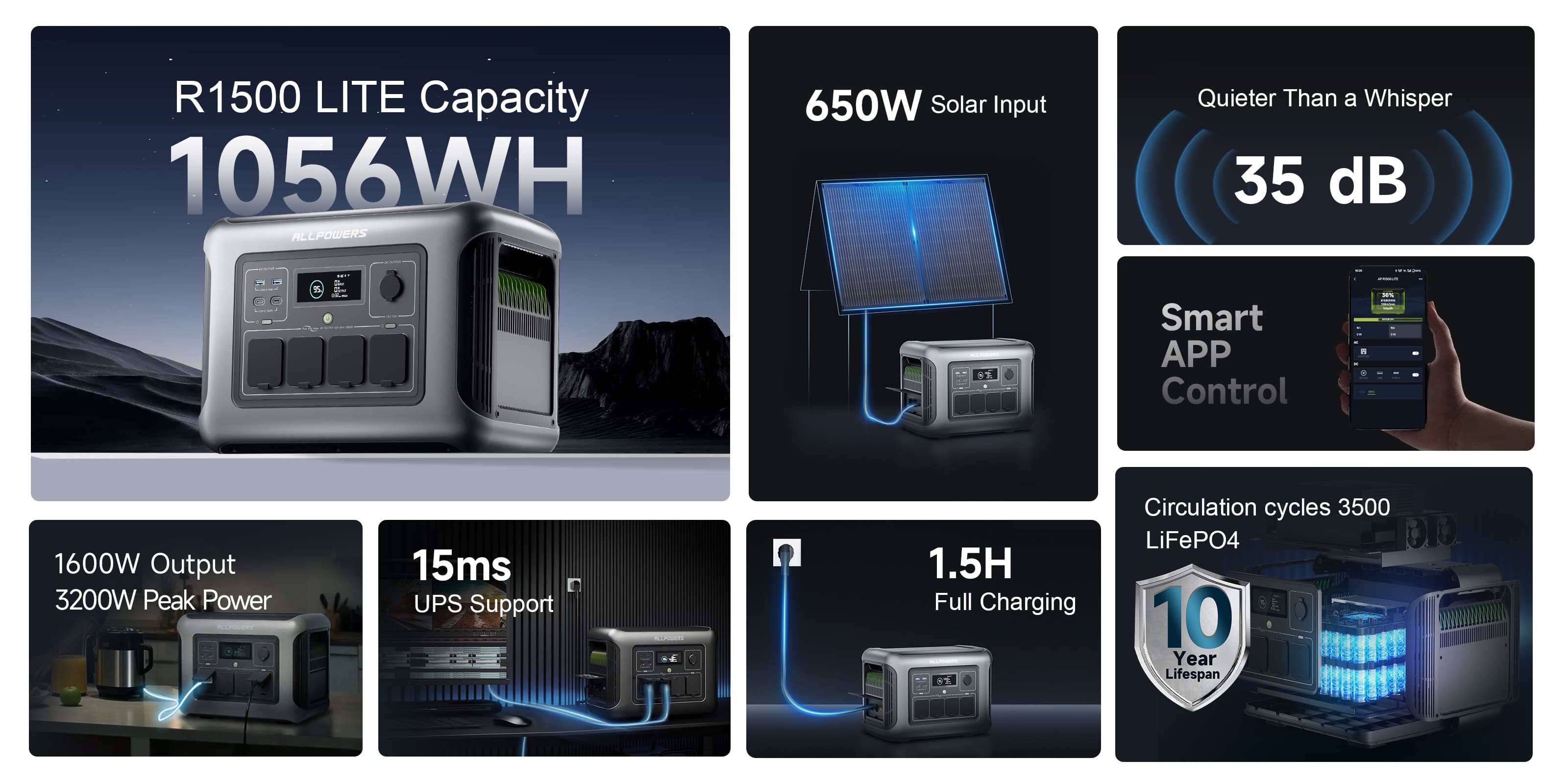 ALLPOWERS R1500 Lite Estación de Energía Portátil 1600W 1056Wh | Respaldo LiFePO4 para el Hogar