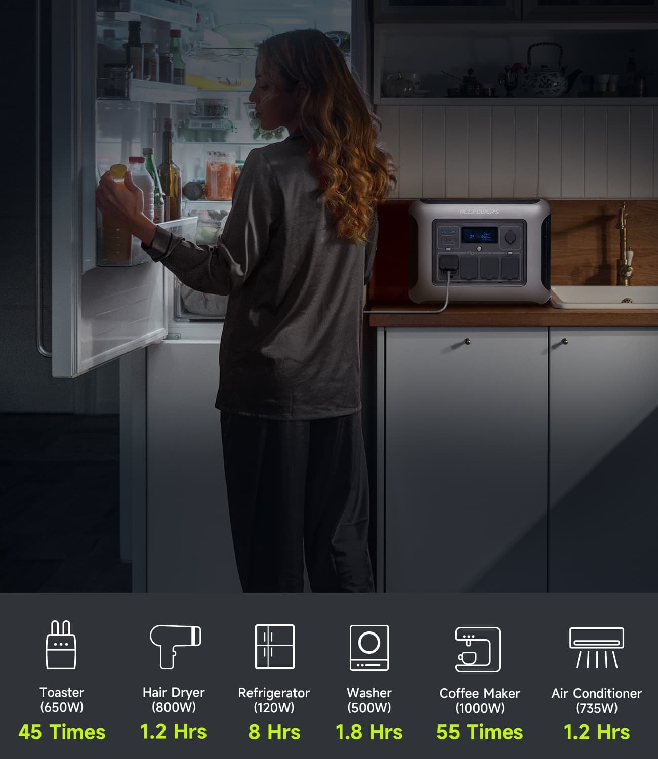 - Ejemplo: Si el R1500 LITE se utiliza para alimentar una hielera portátil de 120W, el tiempo de ejecución sería aproximadamente: 1056Wh * 85% / 120W ≈ 6 horas.