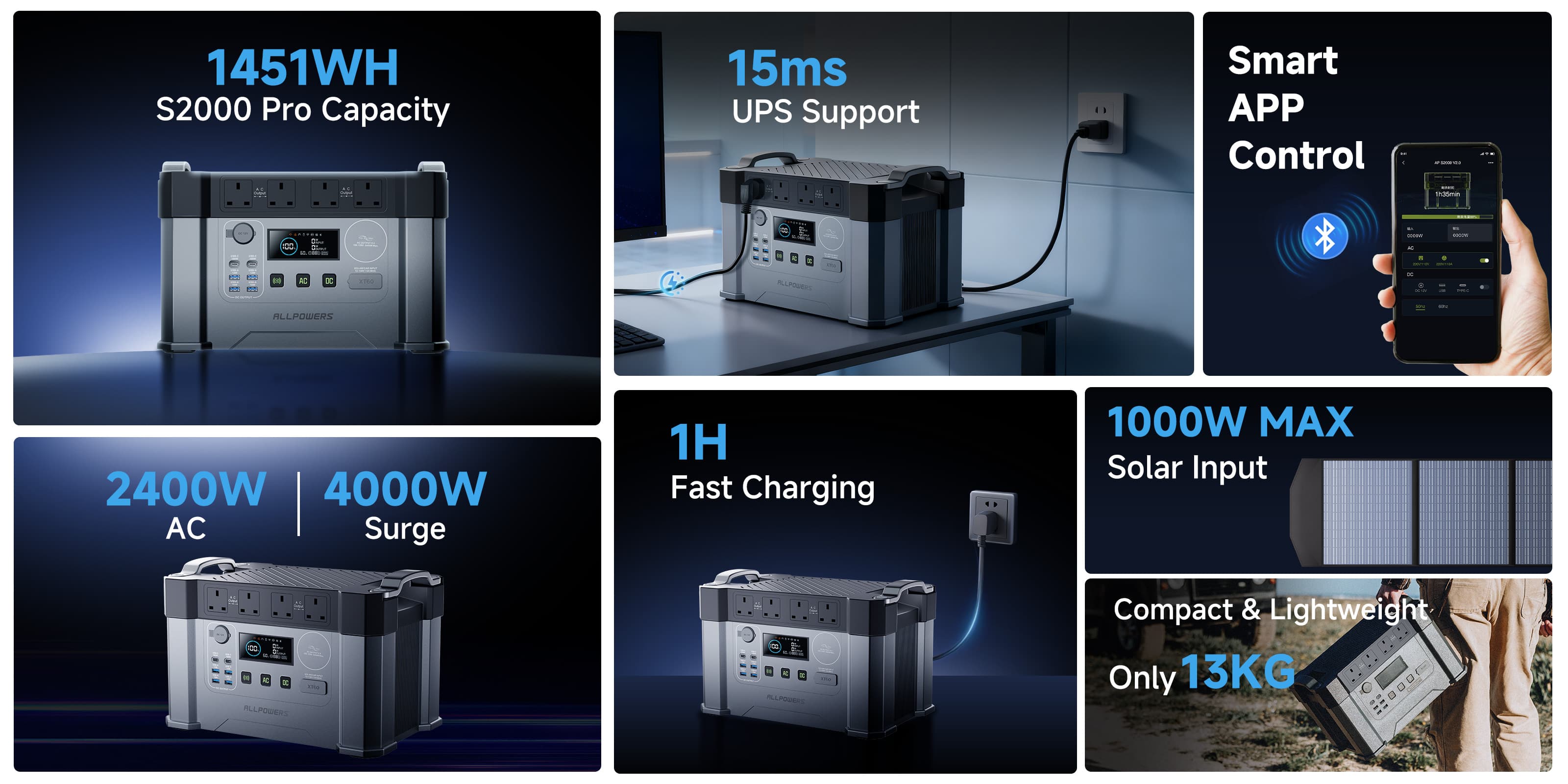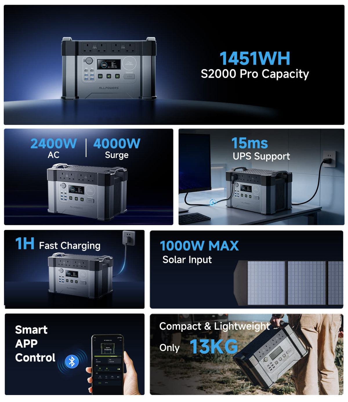 ALLPOWERS S2000 Pro Estación de Energía 2400W 1451Wh | Carga Rápida 1.5 Horas | Generador Solar
