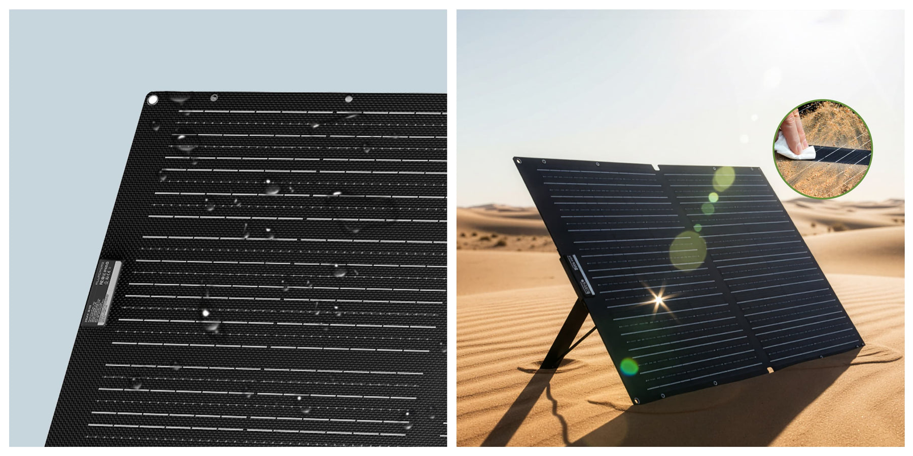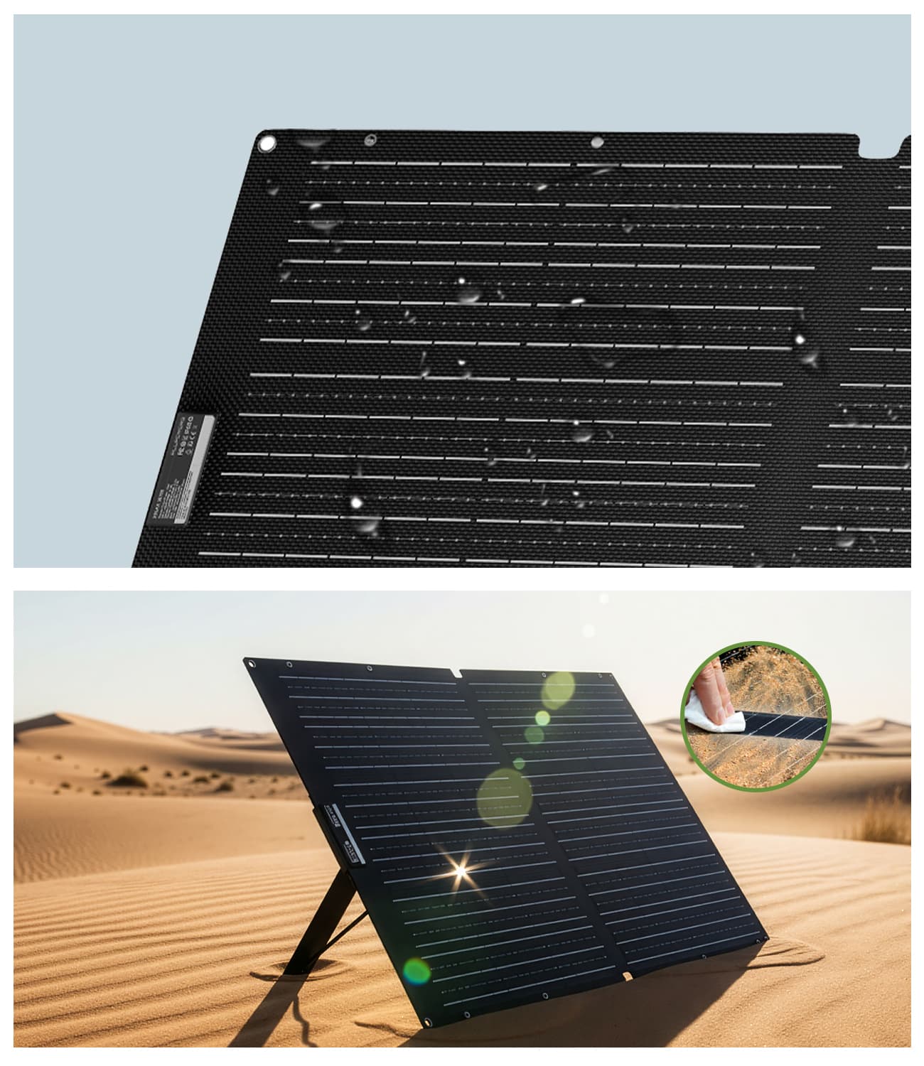 El SOLAX SE100 cuenta con un diseño laminado de una sola pieza que protege totalmente cada celda solar de la humedad, el polvo y la corrosión. Con una clasificación de protección IP68, resiste lluvia, nieve y calor extremo, garantizando energía confiable sin importar a dónde lo lleve su aventura.